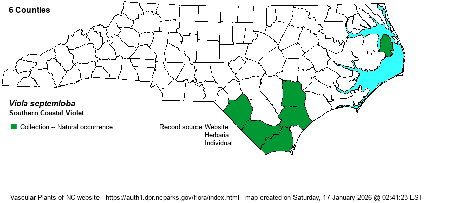 | Distribution | Present only in the southern Coastal Plain, east of the Sandhills region. Ranges north only to Robeson and Duplin counties. Specimens collected elsewhere (Bladen, New Hanover) are believed to be misidentifications. Harvey Ballard annotated NCU collections in July 2024 and verified V. septemloba from Brunswick, Columbus, Duplin, Pender, and Robeson counties. A specimen at NCSC collected by B. Bauers from mainland Dare County in 2002 and annotated by B. Wichmann appears to be correct. Other specimens (at SERNEC Sept. 2024) collected across NC are misidentified and actually are brittoniana, stoneana, fimbriatula, subsinuata, palmata, doubtful ID, or without an image. However, there are a handful of Research Grade photos on iNaturalist from the southeastern counties, in savanna habitat, that seem to corroborate its current existence in the state.