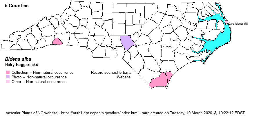 | Taxonomic Comments | Weakley (2020) lists var. radiata as the taxon present in NC. A number of references name this species as B. pilosa. Technically, the name pilosa has priority, but we prefer to use alba as it recalls the main feature of the plant and is the one used by Weakley as occurring in NC.