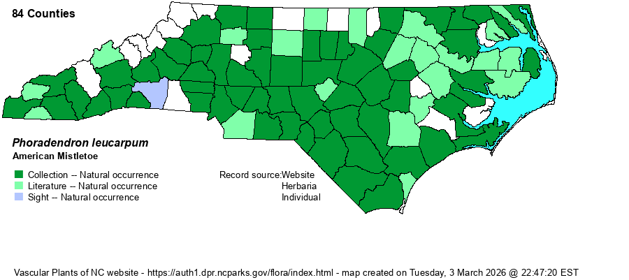 | Taxonomic Comments | The species was formerly named as Phoradendron flavescens and also as P. serotinum (in RAB 1968). Weakley (2018) and others have the species split into several subspecies, not surprising given its very wide range; the taxon here is listed as P. leucarpum ssp. leucarpum.
