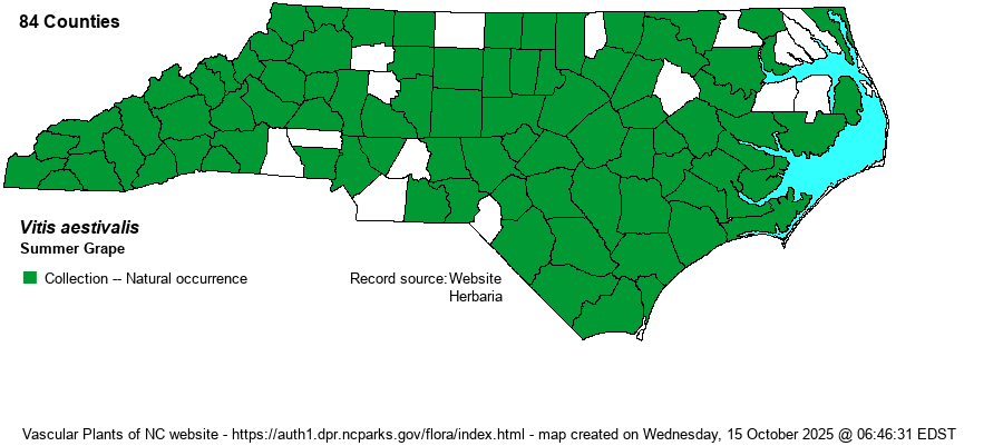 Abundance | Frequent to common across the state, likely the most numerous and widespread grape species in NC, except for Muscadine (Muscadinia rotundifolia); certainly the most common grape in the Coastal Plain. Probably only infrequent in the far eastern counties north and south of Albemarle Sound. | |