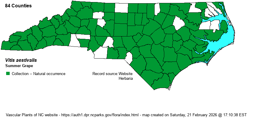 | Abundance | Frequent to common across the state, likely the most numerous and widespread grape species in NC, except for Muscadine (Muscadinia rotundifolia); certainly the most common grape in the Coastal Plain. Probably only infrequent in the far eastern counties north and south of Albemarle Sound. | |