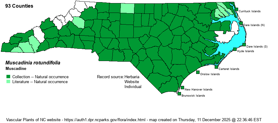 | Taxonomic Comments | Recently it has been placed in a separate genus from other NC grapes – Muscadinia (i.e., Muscadinia rotundifolia); it was formerly named as Vitis rotundifolia. This is hardly a surprise, given the many differences between this species and other Vitis species. Also, Weakley (2018) and some other references list at least two varieties, though the only one in NC is the nominate one.