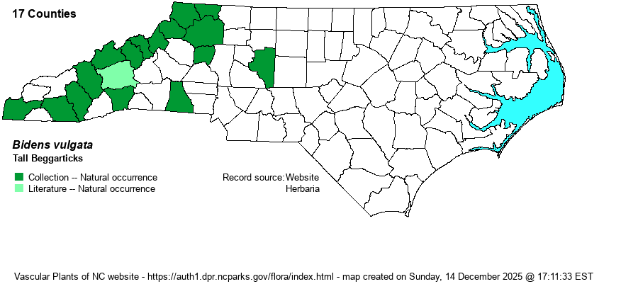 | Identification | This rayless beggarticks is very much like Devil's Beggarticks (B. frondosa), but the heads are larger and with more florets, and the leaves are normally 3-parted (occasionally 5-parted). In addition, there are 10-16 leaf-like bracts at the base of each head (vs. 8 in B. frondosa). On average, this species typically ranges to 3-4 feet tall and is a bit more robust than is the common B. frondosa. | |
