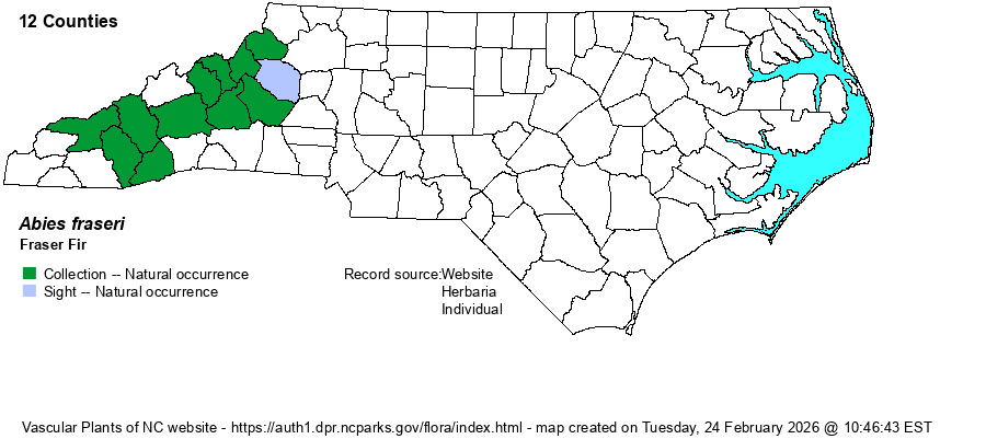 This is a Southern Appalachian endemic, ranging from southwestern VA south to southwestern NC and adjacent TN (only found in these three states as native populations). It is closely related to Balsam Fir (A. balsamea), which ranges south in the central Appalachians to western VA.