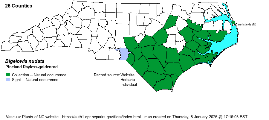 | Identification | Rayless-goldenrods have a unique aspect: a basal rosette of lance-shaped leaves, several small and slender stem leaves, and a flat-topped, bright yellow inflorescence of skinny heads, each with only a few disk florets and no rays. The plants reach an average height of 1.5-2 feet tall. In var. nudata, the basal leaf blades show a distinct taper or narrowing to the leaf stalks, whereas those of var. australis (reported erroneously in NC) are skinny throughout and show a very gradual narrowing from tip to base of the stalks. | |
