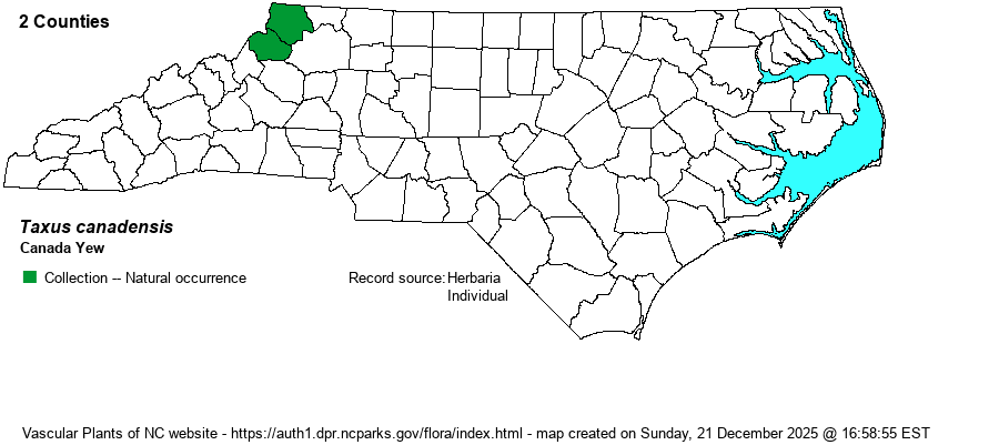 | Identification | This is an unusual species, being a low evergreen shrub that resembles a seedling hemlock at first glance. The height of the plants is only 1-3 feet tall, but it has a number of rather long and spreading branches, so as to appear wider than high. The leaves (needles) -– it is a conifer -– are narrow and linear, dark green and thick, and reach only to about 3/4-inch long. The leaves are arranged in a flat “spray” (a single plane), as in hemlocks. The plant can be separated from Eastern Hemlock (Tsuga canadensis) by the leaves being sharply pointed at the tip, as opposed to being rounded in hemlocks. The fruits are distinctive – orange red arils (berry-like fruit) that average 1/2-inch across and are attached to the middle of the branches. Though the fruit are very distinctive, as hemlocks have brown cones and do not fruit as saplings, normally you must get down to examine the leaves to be sure you have a yew growing around the bogs and adjacent wet areas in the spruce stands. Of course, to see it in NC, you will need to make arrangements, if possible, to visit these privately owned bogs. | |