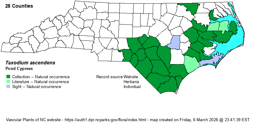 | Habitat | This is a species of standing or slowly moving blackwater areas – Carolina bays, limesink ponds, impoundments and beaver ponds, wet pocosins, and portions of blackwater floodplains, mostly in backswamps. It can occur with the very similar Bald Cypress (T. distichum), though that species has a wider habitat range, to also include brownwater swamps and more flowing waters. Some trees along some blackwater rivers, such as lower Drowning Creek and Lumber River, possess leaf features of both taxa (Sorrie, pers. obs.) and will not key cleanly. |
