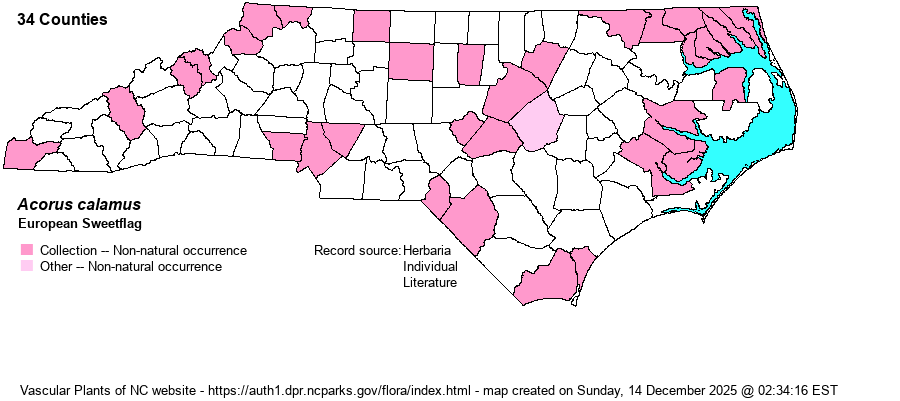 | Identification | The leaves are 2-4 feet tall and closely resemble those of Iris. The inflorescence is at the base of the plant, a thick, dense spike of florets, pale straw-color and blunt-tipped. However, in NC, inflorescences are seldom seen. The native A. americanus does not reach farther south than NJ and OH. | |