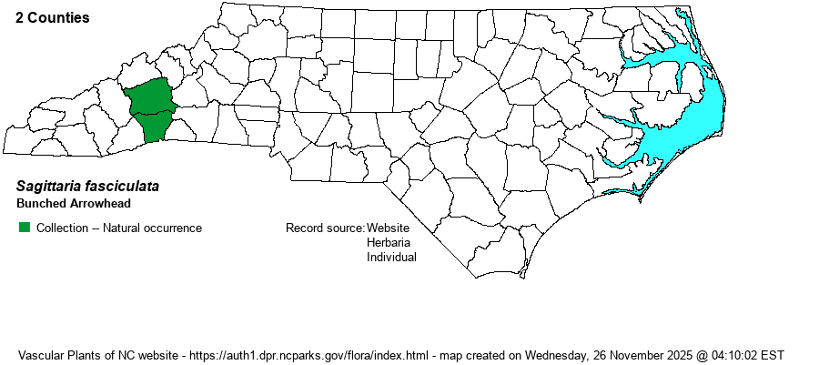 | Identification | This endangered species resembles several other Sagittaria species in its leaves. The several leaves are mostly narrowly elliptic to spatulate (somewhat wider above the middle), growing to about 1 foot tall but only 1-2 inch wide; it does have a short wedge-shaped petiole that merges into the blade. The flowering scape grows to 1-1.5 feet tall, with flowers clustered at 2-4 nodes along this stem. Each flower is about 1 inch wide, with three white petals. It should not be confusable with any other Sagittaria species in its limited sunny to partly sunny wetland habitats in Henderson County. | |