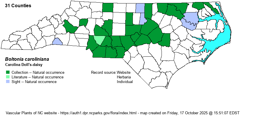 Identification | Carolina Doll's-daisy grows 4-6 feet tall with a waxy smooth stem and leaves, and lacks horizontal rhizomes (contra White Doll's-daisy [B. asteroides]). It tends to be bushier than the latter, with longer branches and a spreading inflorescence. The leaves are lance-shaped to elliptical. The ray florets are shorter than in White Doll's-daisy (3-7.5 mm long vs. 5-13 mm long). From the adventive B. diffusa, it differs in lacking wings on the seeds (vs. wings 0.1-0.5 mm wide) and awns less than 0.4 mm long (vs. 0.4-2.0 mm long). | |
