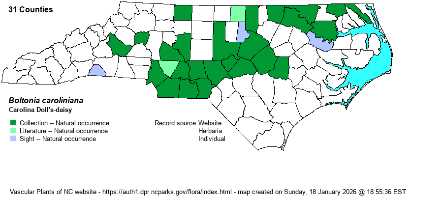 | Identification | Carolina Doll's-daisy grows 4-6 feet tall with a waxy smooth stem and leaves, and lacks horizontal rhizomes (contra White Doll's-daisy [B. asteroides]). It tends to be bushier than the latter, with longer branches and a spreading inflorescence. The leaves are lance-shaped to elliptical. The ray florets are shorter than in White Doll's-daisy (3-7.5 mm long vs. 5-13 mm long). From the adventive B. diffusa, it differs in lacking wings on the seeds (vs. wings 0.1-0.5 mm wide) and awns less than 0.4 mm long (vs. 0.4-2.0 mm long). | |