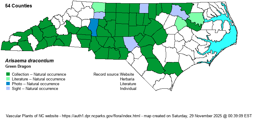| Identification | When in bloom, the species is quite striking and unusual. The stem grows to 2-2.5 feet high, and it is topped by a semi-circle of leaves off the horizontally branched stem. Each of the mostly 7-13 leaves is narrowly elliptical and about 5 inches long and 1-2 inches wide, and they are also held horizontally and spreading outward from the semi-circle of the branched stem (looking fan-shaped when viewed from above). Coming off near the stem base is the flowering stalk, reaching up to about 2 feet tall, with the very long white spadix extending far beyond the spathe like a vertical narrow tongue. This spadix, growing to about 3-5 inches long, is truly unique in our flora and immediately identifies the plant from any other. However, there is another Arisaema species that can somewhat resemble Green Dragon in vegetative character. Arisaema quinatum usually has 5 "leaves", with actually three leaves but the outer two being divided somewhat lengthwise so as to appear like leaves. At first glance, such a plant can resemble a Green Dragon, which rarely has as few as 5 leaves. Certainly, when in bloom, the two are quite different, as the latter has a typical "jack-in-the-pulpit" flower. This species seldom fails to fascinate people who see it, at least in bloom. It perhaps can be most readily seen from alongside greenways that run along Piedmont rivers and larger creeks. In the Coastal Plain, it is most often seen along the Roanoke and Cape Fear rivers. | |