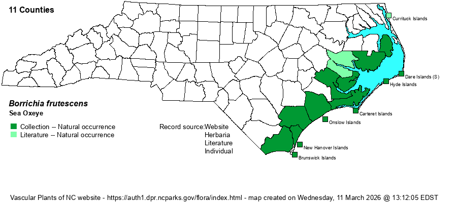 | Identification | This is a unique shrub in the Carolinas, being the only Borrichia in the country; one other occurs in the West Indies. It is a tardily deciduous shrub that grows only to about 2 feet tall, in dense stands. It is often unbranched, and it has very thick and fleshy oblanceolate leaves that grow to 2-2.5 inches long. The leaves tend to be very pale, glaucous gray-green. At the top of each stem is a single large yellow flower with many rays that spread to 1-2 inches from ray tip to tip. Even without the flower it should be easily identified; Iva frutescens has a wider branching pattern and its leaves are thinner, are longer, and are more lanceolate in shape. | |