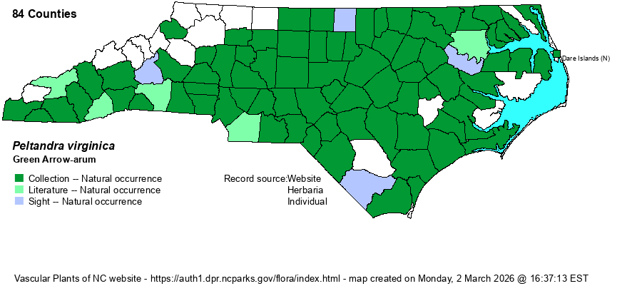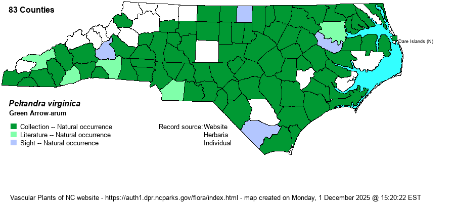 | Distribution | Throughout the Coastal Plain and essentially throughout the Piedmont; of spotty occurrence in the Mountains and far western Piedmont, but could occur in every county.