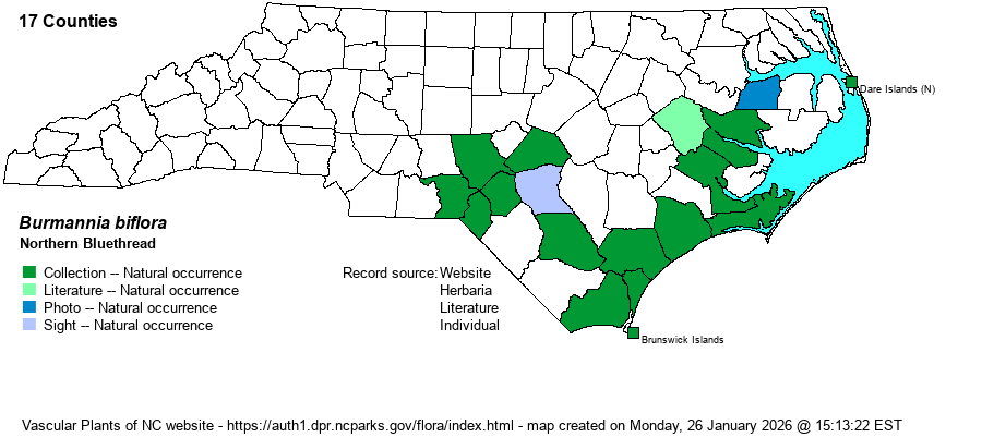 | Distribution | Found across much of the southern half of the Coastal Plain, both coastally and into the Sandhills region. Ranges north to northern Dare, Beaufort, Pitt, Harnett, and Moore counties. However, there are records for nearby VA counties and thus it might be present in NC's northern Coastal Plain. A 2021 photograph was taken at "Pocosin Natural Area" in Washington County.