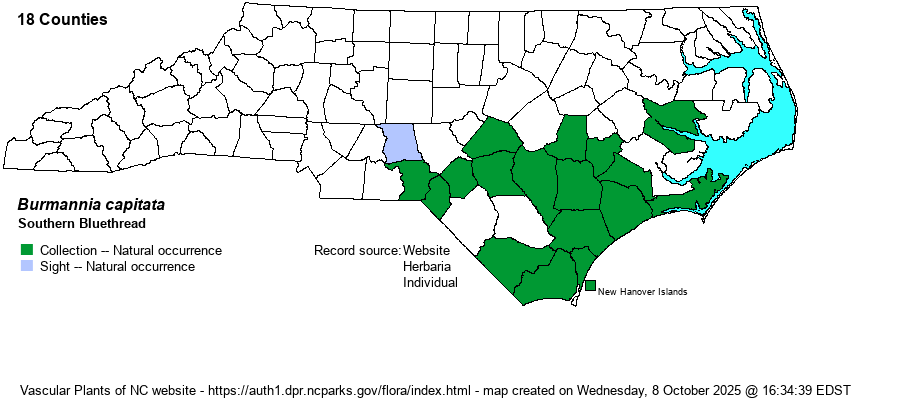 Habitat | Both species of Burmannia occupy very similar habitats in NC, and they can occasionally be found around the same pool or pond margin or sandhill seep. As it is a tiny species, it requires little other competition and generally full sun, being a denizen of savannas, seeps, margins of various ponds and pools, margins of impoundments, and other damp open ground. However, as with B. biflora, most sites are in natural settings and not at ditches or scrapes. | |
