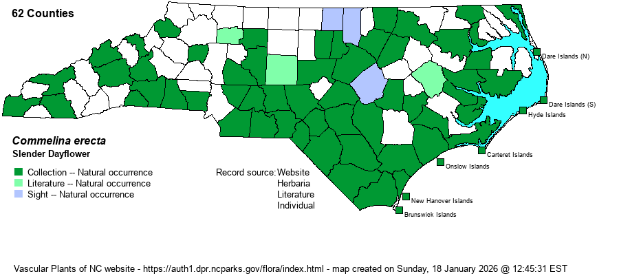 | Identification | This species, though named as "erecta", has leaning to at times erect stems, to about 12-15 inches high. The dark green and fleshy-looking leaves are rather few along the stem; they are narrowly elliptic to lanceolate, entire, and about 4 inches long but about 1 inch wide. At the top of the stem grow several light blue flowers, each consisting of two fairly large and rounded "ears", and one quite small white petal at the bottom appearing like a "chin". The flower measures about 1 inch across. You will note on this and other Commelina species that the flowers grow within or from a large leaf-like or ear-like folded "flap", which is a spathe. Normally one does not have trouble separating this native species from the weedy C. communis, as that exotic species has the upper petals deep blue or rich blue, strongly contrasting with the white lower petal. That species grows in large and dense patches in disturbed ground, and in general it has a somewhat leaning aspect (though this is often not helpful). Another exotic -- C. diffusa -- has all three petals light blue and has the sheath/spathe not fused into a flap. That species does grow in similar sandy places and might appear to be a native, so make sure to see the small white lower petal and the basally fused spathe to be sure you have the native C. erecta. You should be able to find Slender Dayflower along the back sides of dunes, around the margins of Piedmont granitic flatrocks, and various sandhills sites. | |