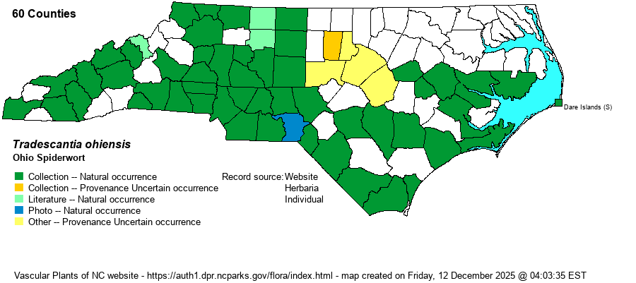 | Distribution | Present throughout the Mountains and the western two-thirds of the Piedmont. The range extends eastward toward the central coast, where it occurs from there southward. It is essentially absent from the northern parts of the Coastal Plain, and of uncertain provenance in the northeastern Piedmont. Plants in the Sandhills proper all are from disturbed habitats and so Ohio Spiderwort may not be native there.