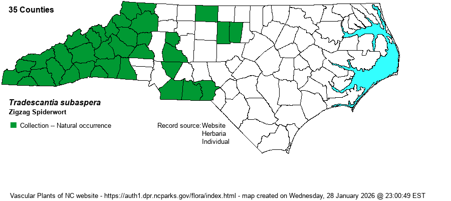 | Distribution | Occurs throughout the Mountains and foothills of the upper Piedmont; widely scattered over the rest of the Piedmont. Absent from the Coastal Plain. There are specimen records for all of the Mountain counties. A number of additional counties have photos on iNaturalist, but most or not confirmed owing either to confusion with T. ohiensis or simply are not identifiable. Also, several Tradescantia species are frequently planted in gardens.