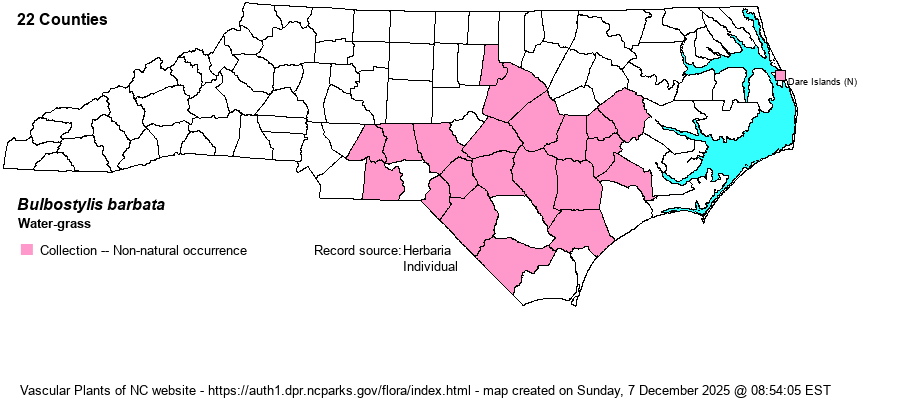 | Identification | Water-grass may grow to a foot tall, but usually only half that. Multiple filiform (very slender) stems grow from one spot, along with short filiform leaves. A single, brown, starburst-like head terminates each stem. See the key in Weakley (2018) to separate from other Bulbostylis. | |
