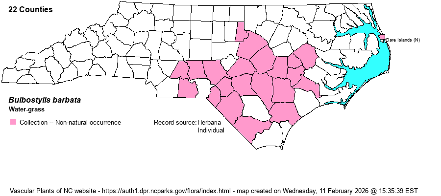 | Identification | Water-grass may grow to a foot tall, but usually only half that. Multiple filiform (very slender) stems grow from one spot, along with short filiform leaves. A single, brown, starburst-like head terminates each stem. See the key in Weakley et al. (2025) to separate from other Bulbostylis. | |