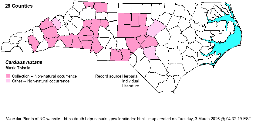 | Identification | Musk or Nodding Thistle is easily identified by the very broad, rose-purple, nodding head and winged stem. C. acanthoides has a smaller, erect head. | |