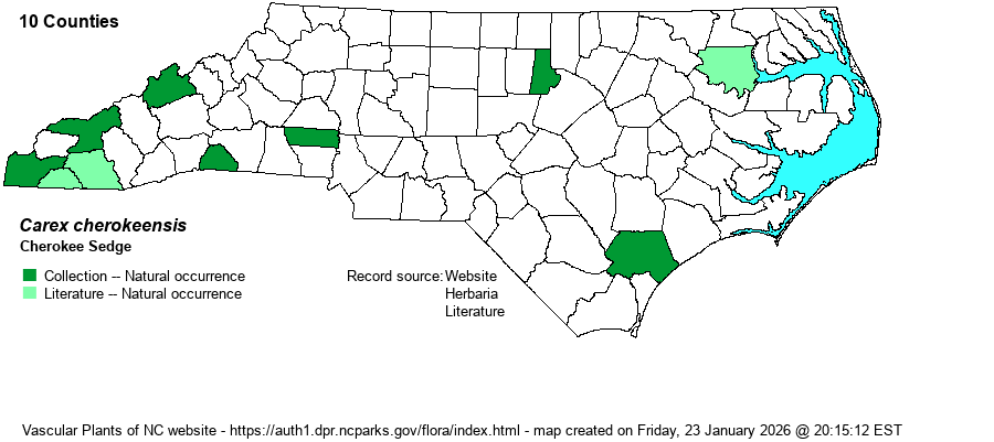 | Identification | Cherokee Sedge grows from a thick rhizome and often forms patches with culms (flowering stems) emerging from a mass of leaves. There are 4-12 female spikes, pale yellowish to straw color, on slender arching or drooping stalks. This is an easily learned and recognized sedge. | |