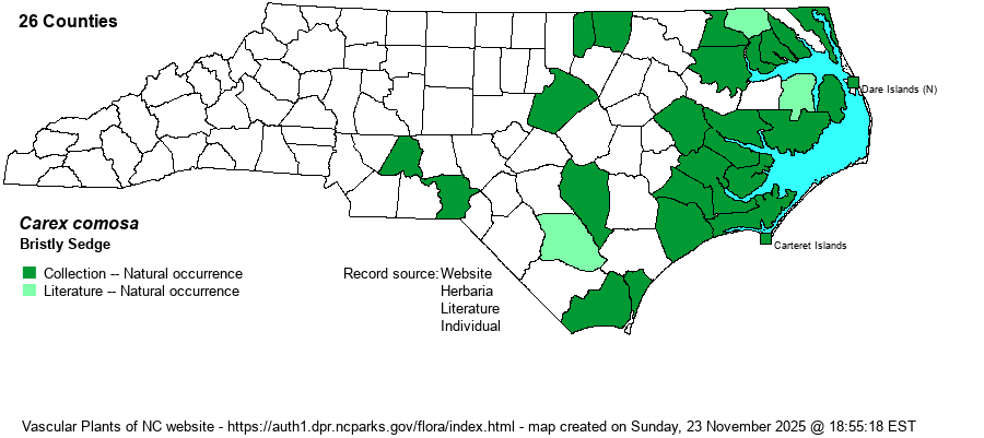 | Habitat | Open, nutrient-rich, riverside marshes (fresh to oligohaline), oxbow marshes, interdune marshes, beaver ponds, ditches. Favors sunny wetlands more than most Carex species. |