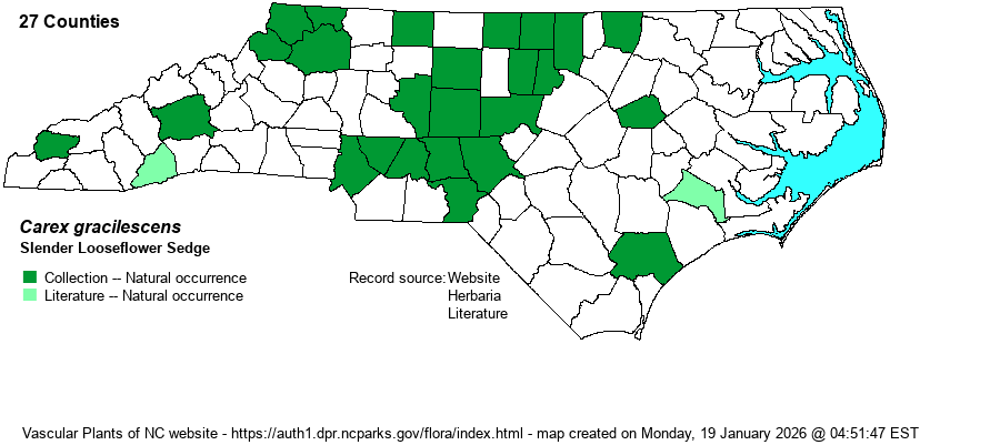 | Identification | A member of the section Laxiflorae, thus needs careful identification. Unlike C. laxiflora, blanda, styloflexa, and chapmanii, the basal sheaths of C. gracilescens are red-purple, not brownish or tan or green. Other relatives in NC with red-purple sheaths are C. manhartii and C. purpurifera, both restricted to the Mountains. From both, C. gracilescens differs it its smaller perigynia (2.4-3.3 mm vs. 3.4-4.5 mm). | |