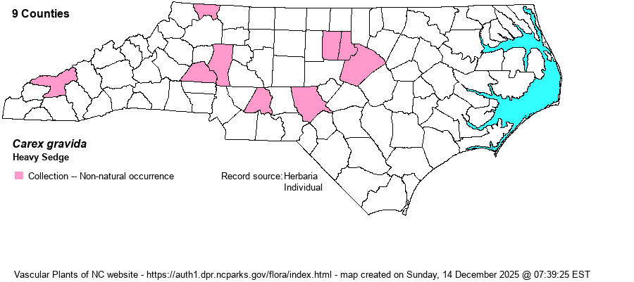 | Taxonomic Comments | The genus Carex is the largest in North America, and among the largest in the world. In temperate and boreal regions, Carex is often the dominant or co-dominant ground layer in many habitats. Seeds (achenes) are valuable food for birds and small mammals, while foliage is used by birds and mammals to make nests and as food by mammals. Species of Carex often look vastly different from one another -- spikes erect vs. drooping, tiny inflorescence vs. whopping, culms leafy vs. naked, perigynia beaked vs. beakless, stems densely bunched vs. single, etc. The genus has been divided into many sections (or groups), based on shared characters; some taxonomists have suggested that these be different genera, but that proves unworkable (so far). All Carex share the feature of a perigynium (an outer covering) which completely surrounds the achene (seed). This covering may fit tightly or loosely (like a small bladder), depending on which group or species. Details of perigynia shape, ornamentation, presence and size of beak, number of striations (or veins) are all important ID features. In recent years Rob Naczi and colleagues have stressed the importance of arrangement of perigynia -- whether spiral (3+ ranks) or distichous (2-ranked) -- and have named a number of new species as well as split off some older synonyms. Therefore, RAB's (1968) key, excellent for its time, can only be used in a general way today. Members of some sections of Carex are difficult to key out (notably Ovales, Laxiflorae, Griseae); this is in part due to variation among individuals of a species, or failings of the key. FNA has drawings of most species and some species may be found in two or more places within a key, to acount for variability. New species to NC, and new to science(!), continue to be found in NC. | |