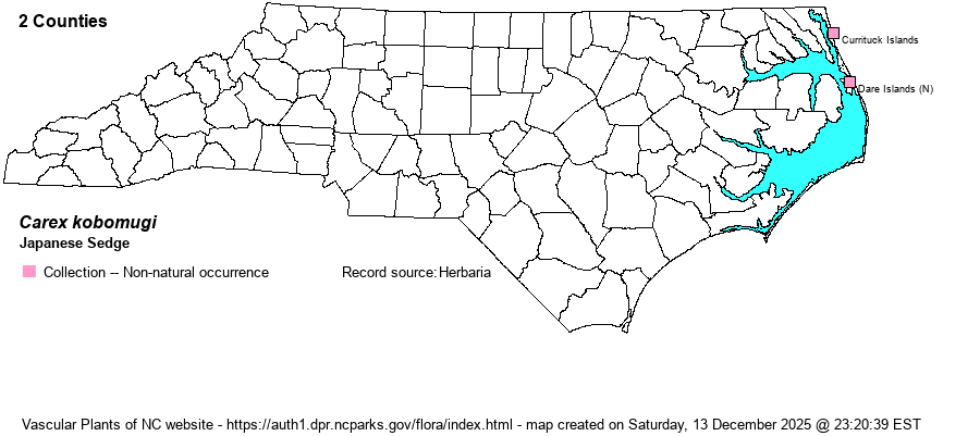 | Taxonomic Comments | The genus Carex is the largest in North America, and among the largest in the world. In temperate and boreal regions, Carex is often the dominant or co-dominant ground layer in many habitats. Seeds (achenes) are valuable food for birds and small mammals, while foliage is used by birds and mammals to make nests and as food by mammals. Species of Carex often look vastly different from one another -- spikes erect vs. drooping, tiny inflorescence vs. whopping, culms leafy vs. naked, perigynia beaked vs. beakless, stems densely bunched vs. single, etc. The genus has been divided into many sections (or groups), based on shared characters; some taxonomists have suggested that these be different genera, but that proves unworkable (so far). All Carex share the feature of a perigynium (an outer covering) which completely surrounds the achene (seed). This covering may fit tightly or loosely (like a small bladder), depending on which group or species. Details of perigynia shape, ornamentation, presence and size of beak, number of striations (or veins) are all important ID features. In recent years Rob Naczi and colleagues have stressed the importance of arrangement of perigynia -- whether spiral (3+ ranks) or distichous (2-ranked) -- and have named a number of new species as well as split off some older synonyms. Therefore, RAB's (1968) key, excellent for its time, can only be used in a general way today. Members of some sections of Carex are difficult to key out (notably Ovales, Laxiflorae, Griseae); this is in part due to variation among individuals of a species, or failings of the key. FNA has drawings of most species and some species may be found in two or more places within a key, to acount for variability. New species to NC, and new to science(!), continue to be found in NC. | |