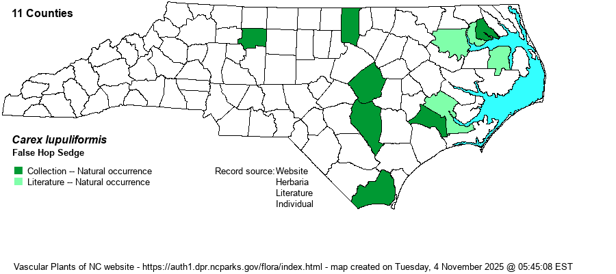 | Distribution | Primarily central and outer Coastal Plain; other records in the Piedmont for Granville and Forsyth counties. A report of lupuliformis from Moore County (Sorrie, 2018 email) is actually of hybrids between C. lupulina and another species, probably C. lurida.  Etienne Lacroix-Carignan of University of Montreal is studying this and other species in the group Lupulinae and has provided verified photos from a new population in Johnston Co.