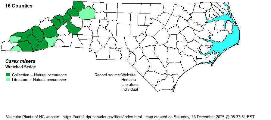 | Identification | Wretched Sedge is densely cespitose (bunched), with slender leaves up to 1.5 feet long, the whole plant often arching over a precipice. Fertile stems have 1-3 slender, ascending, female spikes, with dark brown perigynia scales, each with a green midrib. | |