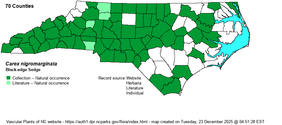 | Distribution | Most of the state, less often in the Coastal Plain. In 2022 Derick Poindexter annotated all specimens at NCU herbarium; these represent 42 counties in the state. Counties with specimens at SERNEC not represented at NCU are: Ashe, Brunswick, Caldwell, Caswell, Cherokee, Columbus, Halifax, Haywood, Henderson, Iredell, Jackson, Johnston, Jones, Lincoln, Macon, Madison, Pender, Polk, Scotland, Swain, Wilkes, and Yancey. These need to be double-checked for ID. Alternatively, new specimens should be collected in those counties, using the key in Weakley et al.
