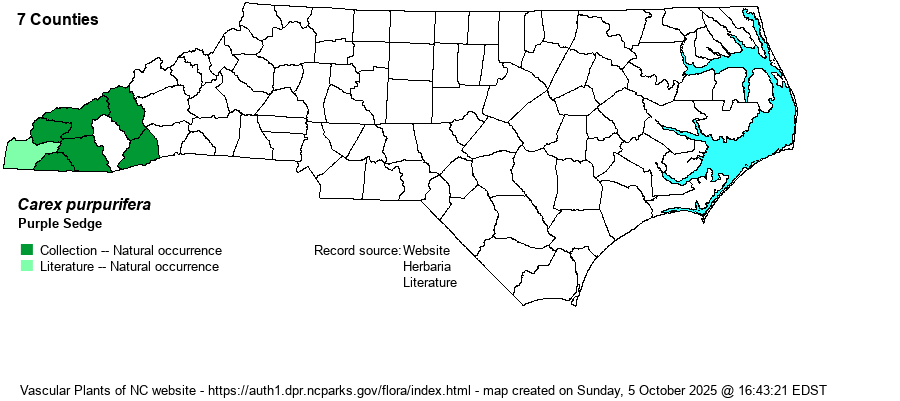 The genus Carex is the largest in North America, and among the largest in the world. In temperate and boreal regions, Carex is often the dominant or co-dominant ground layer in many habitats. Seeds (achenes) are valuable food for birds and small mammals, while foliage is used by birds and mammals to make nests and as food by mammals. Species of Carex often look vastly different from one another -- spikes erect vs. drooping, tiny inflorescence vs. whopping, culms leafy vs. naked, perigynia beaked vs. beakless, stems densely bunched vs. single, etc. The genus has been divided into many sections (or groups), based on shared characters; some taxonomists have suggested that these be different genera, but that proves unworkable (so far). All Carex share the feature of a perigynium (an outer covering) which completely surrounds the achene (seed). This covering may fit tightly or loosely (like a small bladder), depending on which group or species. Details of perigynia shape, ornamentation, presence and size of beak, number of striations (or veins) are all important ID features. In recent years Rob Naczi and colleagues have stressed the importance of arrangement of perigynia -- whether spiral (3+ ranks) or distichous (2-ranked) -- and have named a number of new species as well as split off some older synonyms. Therefore, RAB's (1968) key, excellent for its time, can only be used in a general way today. Members of some sections of Carex are difficult to key out (notably Ovales, Laxiflorae, Griseae); this is in part due to variation among individuals of a species, or failings of the key. FNA has drawings of most species and some species may be found in two or more places within a key, to acount for variability. New species to NC, and new to science(!), continue to be found in NC. | |