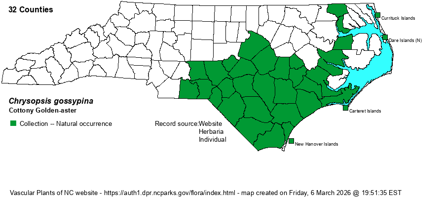 | Chrysopsis gossypina | < | Chrysopsis gossypina ssp. gossypina | Flora of North America (1993b, 1997, 2000, 2002a, 2002b, 2003a, 2004b, 2005, 2006a, 2006b, 2006c, 2007a, 2009, 2010) | | | Chrysopsis gossypina | < | Chrysopsis gossypina ssp. gossypina | | | | Chrysopsis gossypina | < | Chrysopsis gossypina ssp. gossypina | Wunderlin & Hansen Flora of Florida (3) | | | Chrysopsis gossypina | < | Chrysopsis gossypina ssp. gossypina | DeLaney, Wunderlin, & Semple (2003). Key adapted from Semple (1981) and Semple in FNA (2006b). [also see Bradburia, < | | | Chrysopsis gossypina | < | Heterotheca gossypina | Radford, Ahles, and Bell (1968) | (also see C. pilosa) | | Chrysopsis gossypina | < | Chrysopsis gossypina | Gleason and Cronquist (1991) | | | Chrysopsis gossypina | < | Chrysopsis gossypina | Gleason (1952) | | | Chrysopsis gossypina | < | Chrysopsis gossypina | Vascular Flora of the Southeastern States (Cronquist 1980, Isely 1990) | | | Chrysopsis gossypina | > | Chrysopsis longii | Fernald (1950) | | | Chrysopsis gossypina | >< | Chrysopsis arenicola | Small (1933, 1938) | | | Chrysopsis gossypina | > | Chrysopsis decumbens | Small (1933, 1938) | | | Chrysopsis gossypina | > | Chrysopsis pilosa | Small (1933, 1938) | , misapplied | | Chrysopsis gossypina | < | Heterotheca gossypina | DeLaney, Wunderlin, & Semple (2003). Key adapted from Semple (1981) and Semple in FNA (2006b). [also see Bradburia, < | | | Source: Weakley's Flora |
