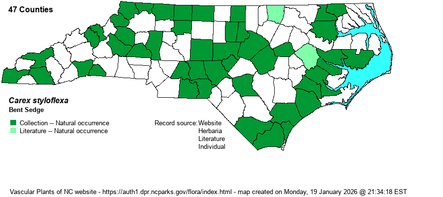 | Identification | In Bent Sedge, the lowest spikes grow at the ends of long, arching or drooping stalks (sometimes called "danglers"). C. crebriflora may also have a "dangler", but its upper spikes are densely crowded (vs. loosely in C. styloflexa). C. chapmanii differs only in possessing long horizontal rhizomes connecting plants. | |
