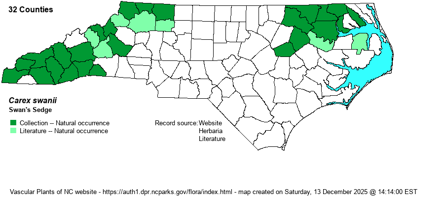 The genus Carex is the largest in North America, and among the largest in the world. In temperate and boreal regions, Carex is often the dominant or co-dominant ground layer in many habitats. Seeds (achenes) are valuable food for birds and small mammals, while foliage is used by birds and mammals to make nests and as food by mammals. Species of Carex often look vastly different from one another -- spikes erect vs. drooping, tiny inflorescence vs. whopping, culms leafy vs. naked, perigynia beaked vs. beakless, stems densely bunched vs. single, etc. The genus has been divided into many sections (or groups), based on shared characters; some taxonomists have suggested that these be different genera, but that proves unworkable (so far). All Carex share the feature of a perigynium (an outer covering) which completely surrounds the achene (seed). This covering may fit tightly or loosely (like a small bladder), depending on which group or species. Details of perigynia shape, ornamentation, presence and size of beak, number of striations (or veins) are all important ID features. In recent years Rob Naczi and colleagues have stressed the importance of arrangement of perigynia -- whether spiral (3+ ranks) or distichous (2-ranked) -- and have named a number of new species as well as split off some older synonyms. Therefore, RAB's (1968) key, excellent for its time, can only be used in a general way today. Members of some sections of Carex are difficult to key out (notably Ovales, Laxiflorae, Griseae); this is in part due to variation among individuals of a species, or failings of the key. FNA has drawings of most species and some species may be found in two or more places within a key, to acount for variability. New species to NC, and new to science(!), continue to be found in NC. | |