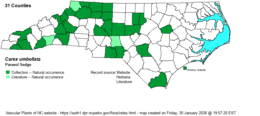 | Distribution | Mostly in the Piedmont and Mountains, but with gaps; rare in the upper Coastal Plain, and very rare toward the coast (i.e., Brunswick and Onslow counties). Most gaps will likely be filled with additional collecting. In 2022 Derick Poindexter annotated all specimens of this species group at NCU herbarium; they represent Alleghany, Brunswick, Onslow, Orange, Randolph, Richmond, and Rowan counties. That is only 7 counties; the other 21 counties on our map are at other herbaria and need their specimens double-checked for ID.