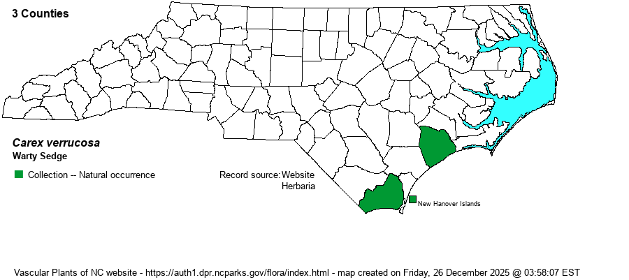 | Distribution | Carex verrucosa blooms in late spring, and fruits mature in June - early July. By contrast, C. glaucescens and C. joorii bloom in July-August and fruit later, but nonetheless have been misidentified as C. verrucosa. At this point in time, sight records cannot be accepted. One website editor (Sorrie) believes that the species has been greatly over-reported, such as in the NCNHP database, which lists records for 11 counties (many from Carolina Vegetation Survey plots), including a few in the Sandhills region where Sorrie has never seen C. verrucosa. The map is probably conservative, but caution on identification of records is warranted. The range in the state is essentially limited to the southeastern coastal counties, until proven otherwise.