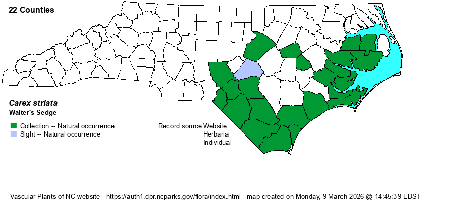 | Identification | Carex striata var. striata can be told from var. brevis only by smooth perigynia (vs. pubescent). The two entities occupy identical habitats and may occur together. An examination of NC and SC specimens in 2018 by B. Sorrie showed that pubescence is variable: while most specimens had glabrous perigynia, others had glabrous bodies and pubescent beaks, others half pubescent bodies with pubescent beaks, and a few were wholly pubescent. Thus, there was no definite pattern to the pubescence across populations. | |