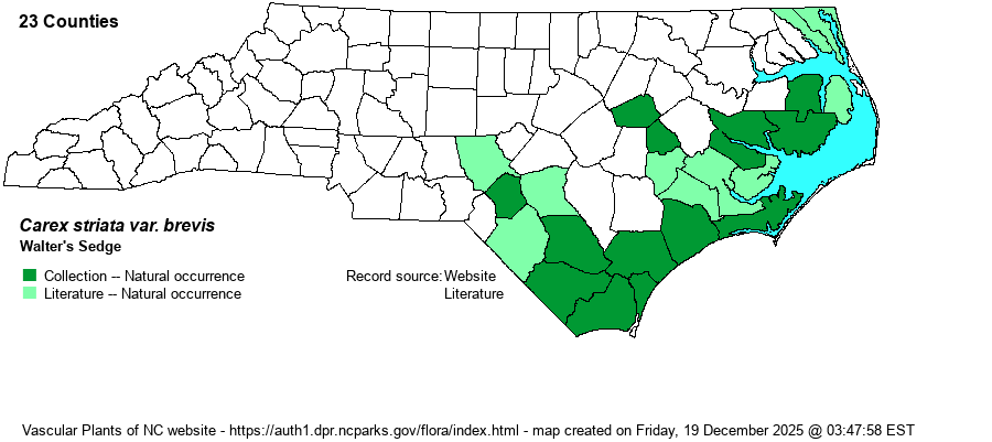 | Taxonomic Comments | The genus Carex is the largest in North America, and among the largest in the world. In temperate and boreal regions, Carex is often the dominant or co-dominant ground layer in many habitats. Seeds (achenes) are valuable food for birds and small mammals, while foliage is used by birds and mammals to make nests and as food by mammals. Species of Carex often look vastly different from one another -- spikes erect vs. drooping, tiny inflorescence vs. whopping, culms leafy vs. naked, perigynia beaked vs. beakless, stems densely bunched vs. single, etc. The genus has been divided into many sections (or groups), based on shared characters; some taxonomists have suggested that these be different genera, but that proves unworkable (so far). All Carex share the feature of a perigynium (an outer covering) which completely surrounds the achene (seed). This covering may fit tightly or loosely (like a small bladder), depending on which group or species. Details of perigynia shape, ornamentation, presence and size of beak, number of striations (or veins) are all important ID features. In recent years Rob Naczi and colleagues have stressed the importance of arrangement of perigynia -- whether spiral (3+ ranks) or distichous (2-ranked) -- and have named a number of new species as well as split off some older synonyms. Therefore, RAB's (1968) key, excellent for its time, can only be used in a general way today. Members of some sections of Carex are difficult to key out (notably Ovales, Laxiflorae, Griseae); this is in part due to variation among individuals of a species, or failings of the key. FNA has drawings of most species and some species may be found in two or more places within a key, to acount for variability. New species to NC, and new to science(!), continue to be found in NC. | |