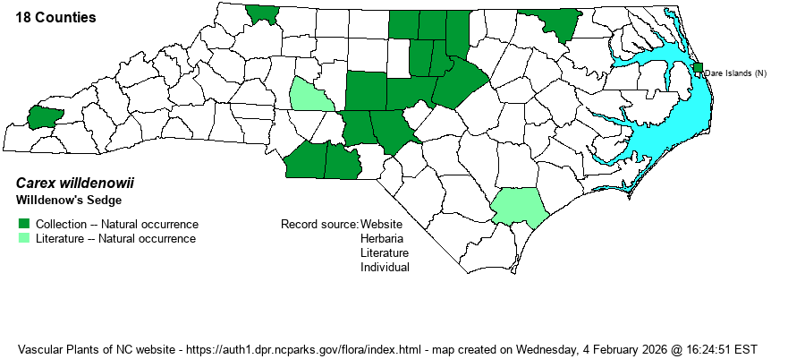 The genus Carex is the largest in North America, and among the largest in the world. In temperate and boreal regions, Carex is often the dominant or co-dominant ground layer in many habitats. Seeds (achenes) are valuable food for birds and small mammals, while foliage is used by birds and mammals to make nests and as food by mammals. Species of Carex often look vastly different from one another -- spikes erect vs. drooping, tiny inflorescence vs. whopping, culms leafy vs. naked, perigynia beaked vs. beakless, stems densely bunched vs. single, etc. The genus has been divided into many sections (or groups), based on shared characters; some taxonomists have suggested that these be different genera, but that proves unworkable (so far). All Carex share the feature of a perigynium (an outer covering) which completely surrounds the achene (seed). This covering may fit tightly or loosely (like a small bladder), depending on which group or species. Details of perigynia shape, ornamentation, presence and size of beak, number of striations (or veins) are all important ID features. In recent years Rob Naczi and colleagues have stressed the importance of arrangement of perigynia -- whether spiral (3+ ranks) or distichous (2-ranked) -- and have named a number of new species as well as split off some older synonyms. Therefore, RAB's (1968) key, excellent for its time, can only be used in a general way today. Members of some sections of Carex are difficult to key out (notably Ovales, Laxiflorae, Griseae); this is in part due to variation among individuals of a species, or failings of the key. FNA has drawings of most species and some species may be found in two or more places within a key, to acount for variability. New species to NC, and new to science(!), continue to be found in NC. | |