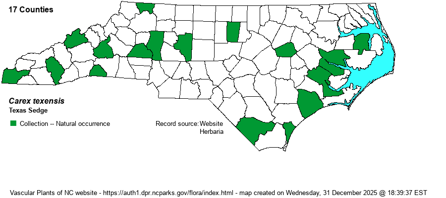 | Identification | Texas Sedge is closely similar to C. retroflexa and can be separated by narrower perigynia (1-1.3 mm wide vs. 1.4-1.8 mm wide). | |