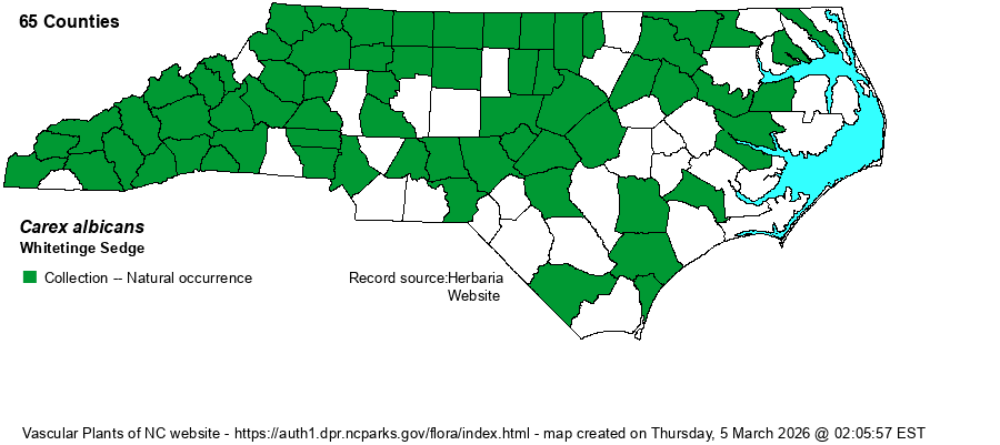 | Taxonomic Comments | This species was named as C. artitecta in RAB (1968). The Carex albicans group, including also C. floridana and C. nigromarginata, has been considered difficult to resolve into species versus varieties. Field experience and practice with the keys are necessary for proper ID.