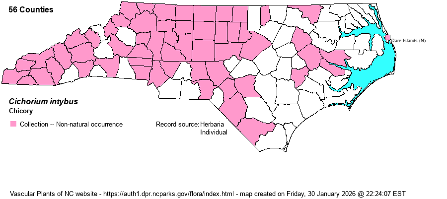 | Identification | Chicory is easily recognizable by its light blue to lavender-blue flower heads about 1.5-2 inches across and composed only of ray florets. The species is quite familiar to people in the western and central parts of the state, though not so nearer to the coast. | |