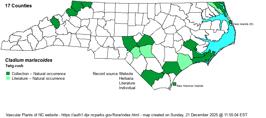 | Other Common Name(s) | Smooth Sawgrass, Fin-sedge. More references call this as Smooth Sawgrass, but that name causes some confusion with C. jamaicense, usually known as just Sawgrass. As it is so different from that species, also seemingly in separate genera, Twig-rush is used by enough entities to be adopted here. | |