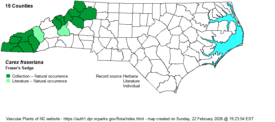 | Taxonomic Comments | Often placed in its own genus as Cymophyllus fraserianus, but genetic data show its true affinity with Carex.