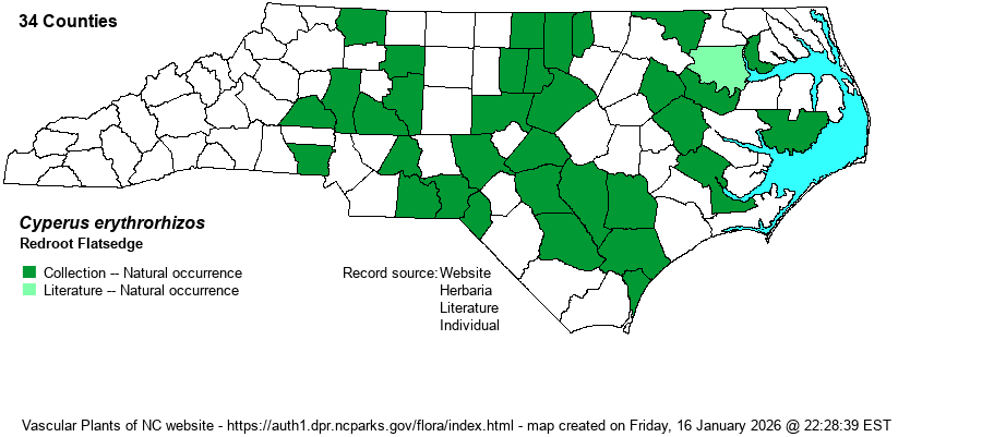 The genus Cyperus is mostly tropical and warm-temperate in distribution; thus, in NC it is much commoner in the Coastal Plain than in the Mountains and Piedmont. Most species have 1-few flowering stems (culms) from grasslike basal leaves, plus a few stem leaves. At the summit is an inflorescence of very open and branched, or tightly packed, spikes, varying among species from brown to golden brown to straw-color to reddish. The arrangement of the spikelets is important, whether like a hand (digitate) or in paired or alternate rows (pinnate); as is the shape of the achene (seed), whether bi-convex in cross-section or triangular. As a group, Cyperus tends to be weedy and readily enters disturbed ground; this is true for many natives as well as all the aliens. In recent years, following DNA research, the genus has incorporated several genera that in RAB (1968) or other manuals were separate: Hemicarpha, Lipocarpha, and Kyllinga. | |