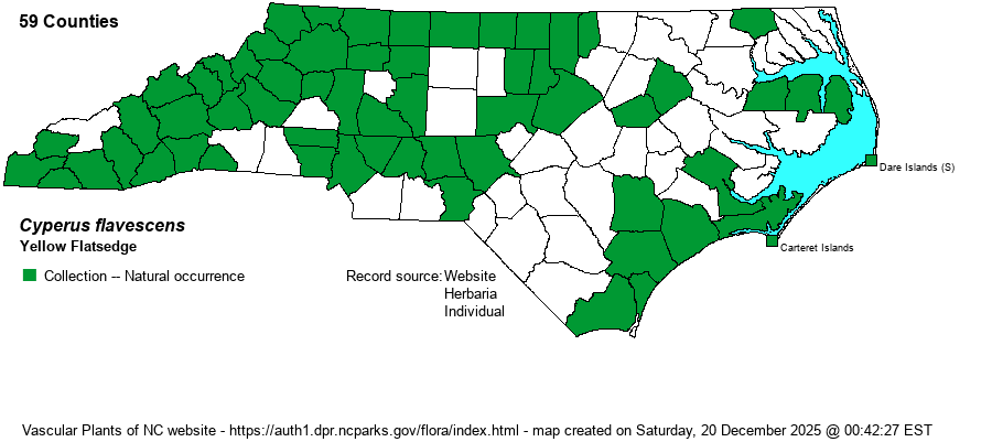 The genus Cyperus is mostly tropical and warm-temperate in distribution; thus, in NC it is much commoner in the Coastal Plain than in the Mountains and Piedmont. Most species have 1-few flowering stems (culms) from grasslike basal leaves, plus a few stem leaves. At the summit is an inflorescence of very open and branched, or tightly packed, spikes, varying among species from brown to golden brown to straw-color to reddish. The arrangement of the spikelets is important, whether like a hand (digitate) or in paired or alternate rows (pinnate); as is the shape of the achene (seed), whether bi-convex in cross-section or triangular. As a group, Cyperus tends to be weedy and readily enters disturbed ground; this is true for many natives as well as all the aliens. In recent years, following DNA research, the genus has incorporated several genera that in RAB (1968) or other manuals were separate: Hemicarpha, Lipocarpha, and Kyllinga. | |